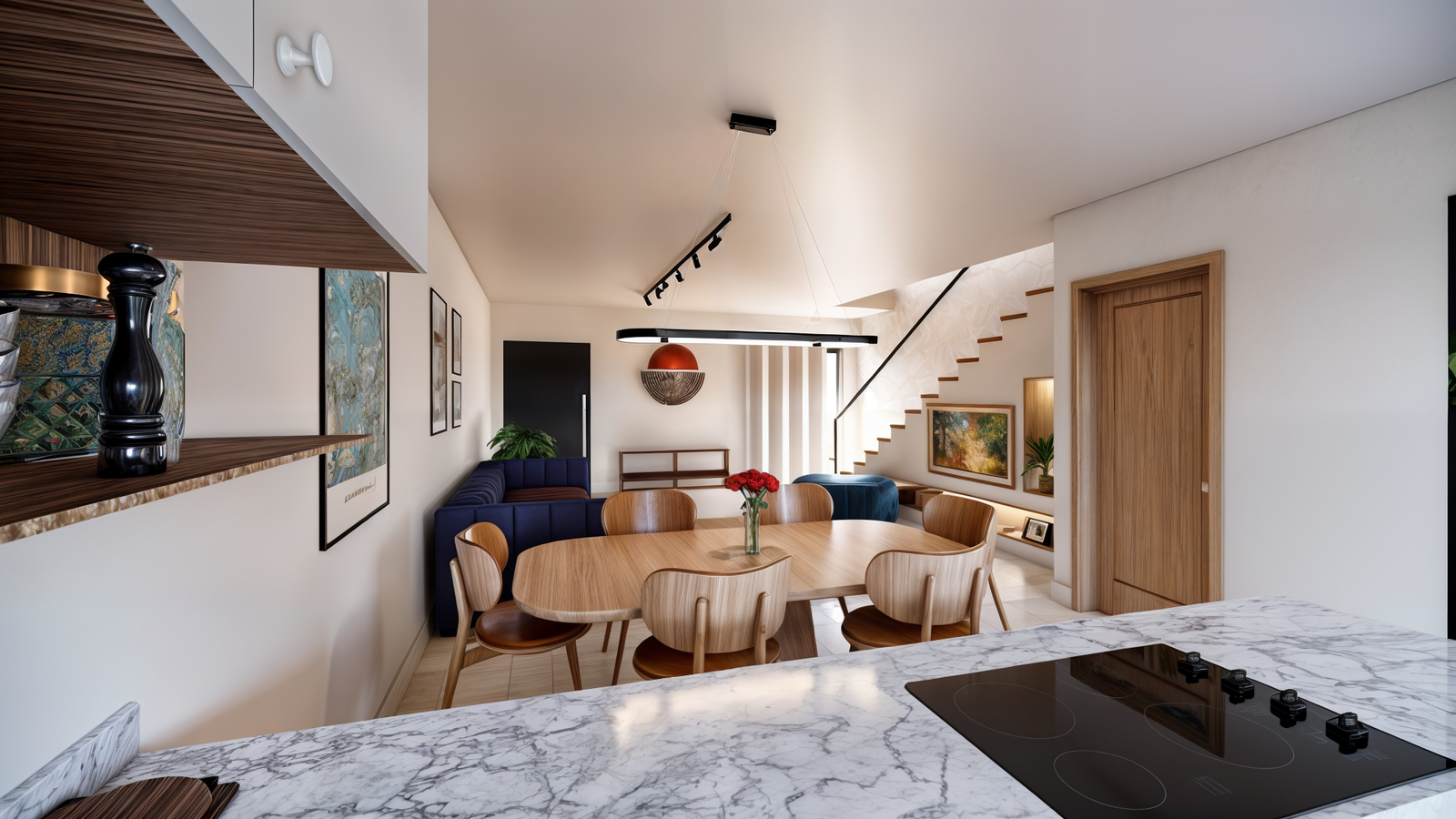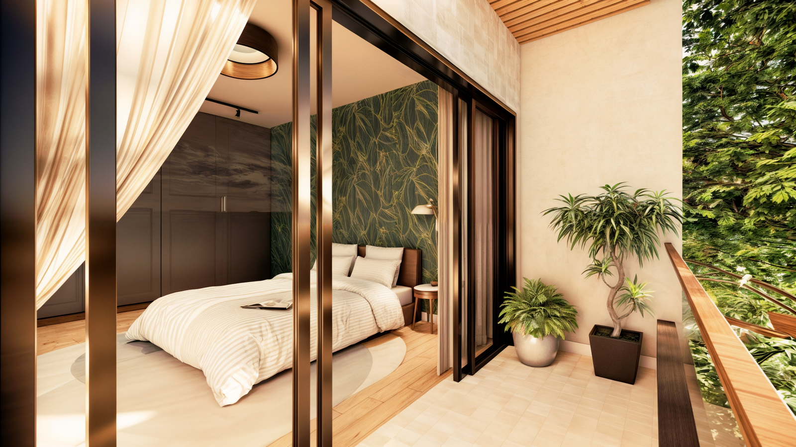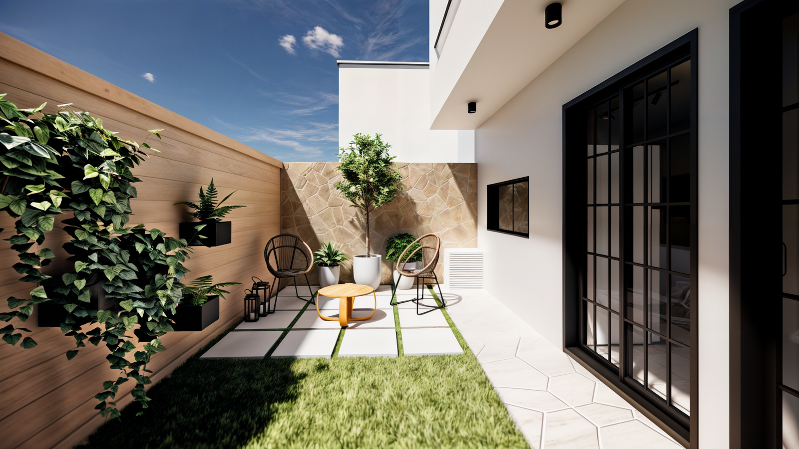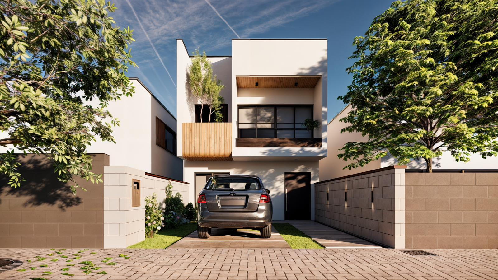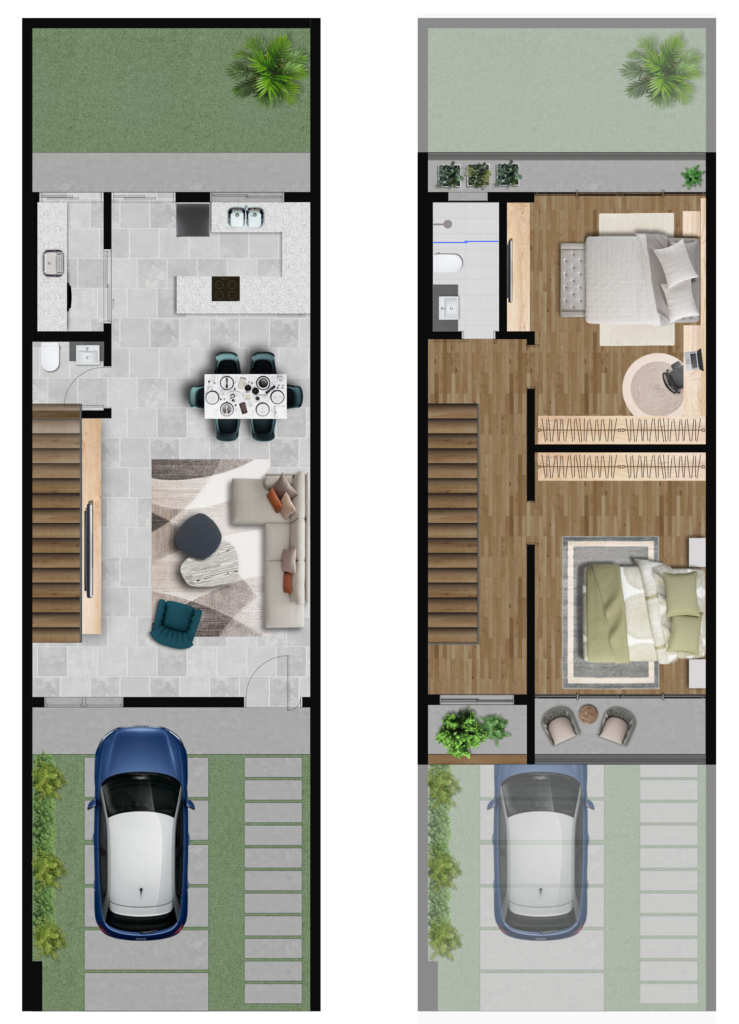 Este sobrado de dois pavimentos com design moderno chama atenção pelo contraste dos materiais, a ampla varanda complementa a fachada minimalista. No pavimento térreo, sala, copa e cozinha são integrados em uma ampla área social, e, ao fundo, o quintal pode servir tanto como uma extensão da área social, como um belo jardim privativo para os moradores. A lavanderia e o lavabo complementam o térreo como área de apoio. No pavimento superior, os dois quartos duplos contam com varandas privativas, oferecendo um espaço agradável para relaxar e apreciar a vista.